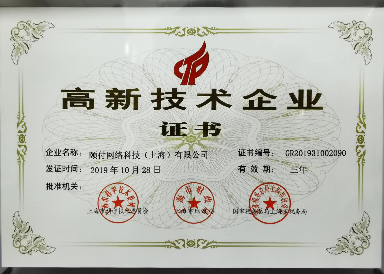 近日,凭借过硬的研发实力和创新能力,颐付网络科技收到了由上海市科技委员会、上海市财政局、国家税务总局上海市税务局联合颁发的“高新技术企业”认定证书,由此正式迈入国家高新技术企业行列。
