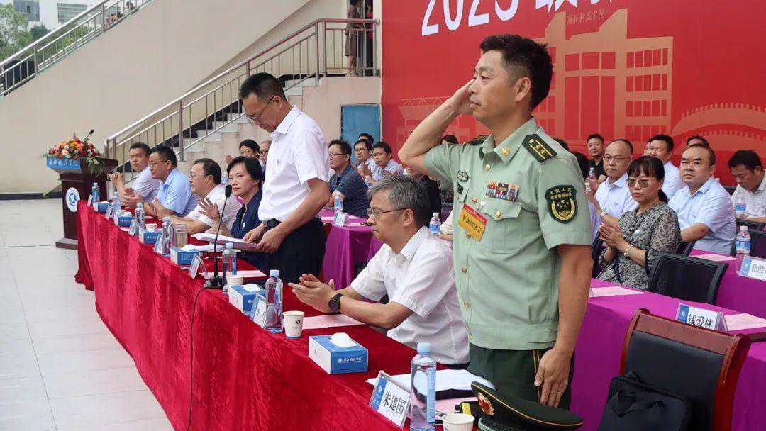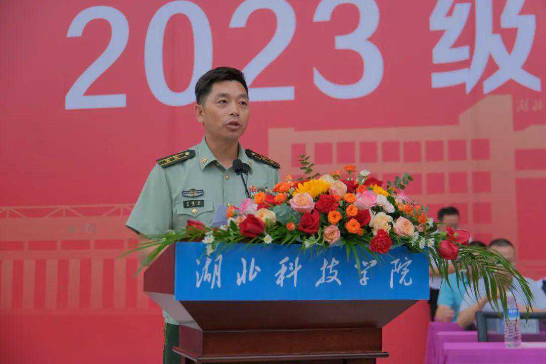 闫英姿代表全校师生员工对2023级新同学的到来表示热烈的欢迎,向承担新生军训任务的全体教官表示诚挚的谢意。她向同学们回顾了学校86年克难奋进、栉风沐雨的办学历史,讲授了学校的“弘德、博学、敏行、敢先”的校训精神,介绍了一代代湖科人踔厉奋发、务实笃行的光辉业绩,描绘了学校乘势而上、逐梦前行的发展蓝图。