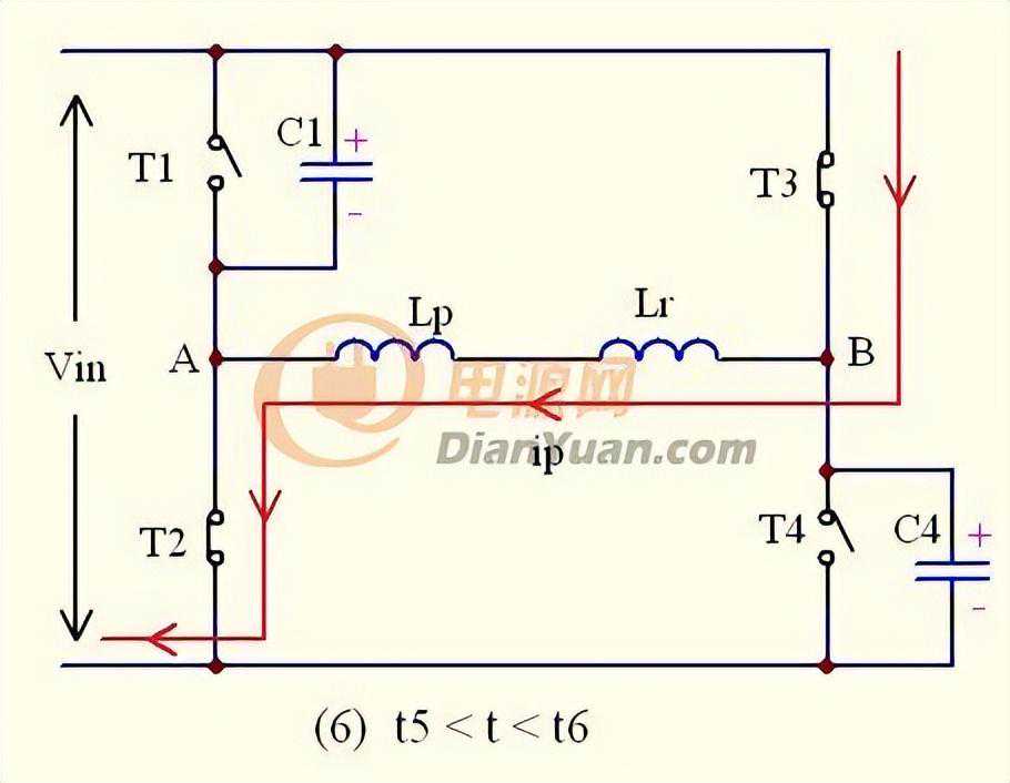 在t5-t6的时间内,副边的二极管D1,D2还是同时导通流过电流,将副边绕组短路,阻断输出电感反射到初级的途径,此时的负载电流还是由次级电感与输出电容提供;同时,由于原边的T2,T3已经导通,原边电流ip流过T3--Lr--T2,又因为Lr很小,所以原边电流ip就会反向急剧增大。