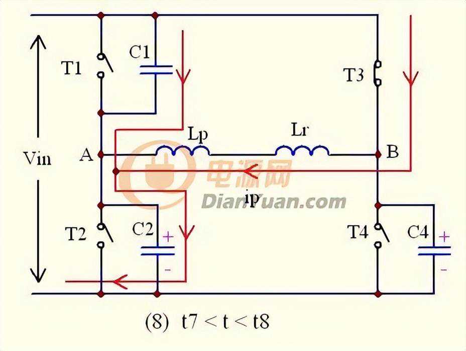 如上图,此时T1与T4同时导通,T2与T3同时关断,原边电流的流向是T1—Lp—Lk—T4,如图所示。
