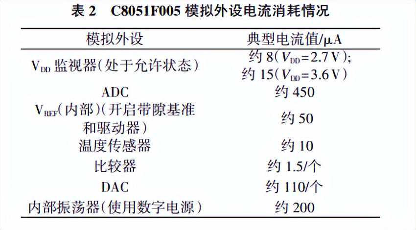 应用系统中C8051F005微控制器使用的模拟外设包括:ADC、外部振荡器、VDD监视器,各模拟外设消耗电流如表4所示。