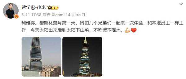 【CNMO科技消息】据CNMO了解,小米一众高管近期频频现身海外市场。小米集团合伙人、总裁,国际部总裁,小米品牌总经理卢伟冰发微博表示,终于完成了巴塞罗那-马德里-拉各斯-开罗-利雅得的出差。有意思的是,小米集团高级副总裁、手机部总裁曾学忠还在利雅得体验了穆斯林的斋月礼仪。