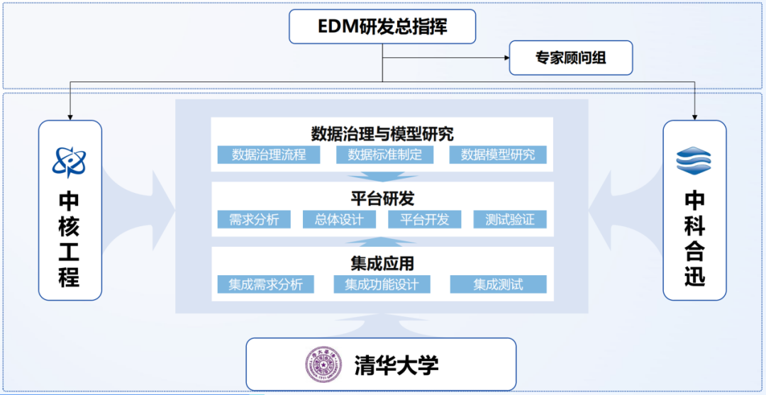 在EDM平台自主研发过程中,中核工程积极探索研发组织新模式,形成了由政府提供政策引导、工业公司(中核工程)牵头、高校(清华大学)提供理论支撑、IT公司(合迅科技)软件工程化的新型研发组织模式。