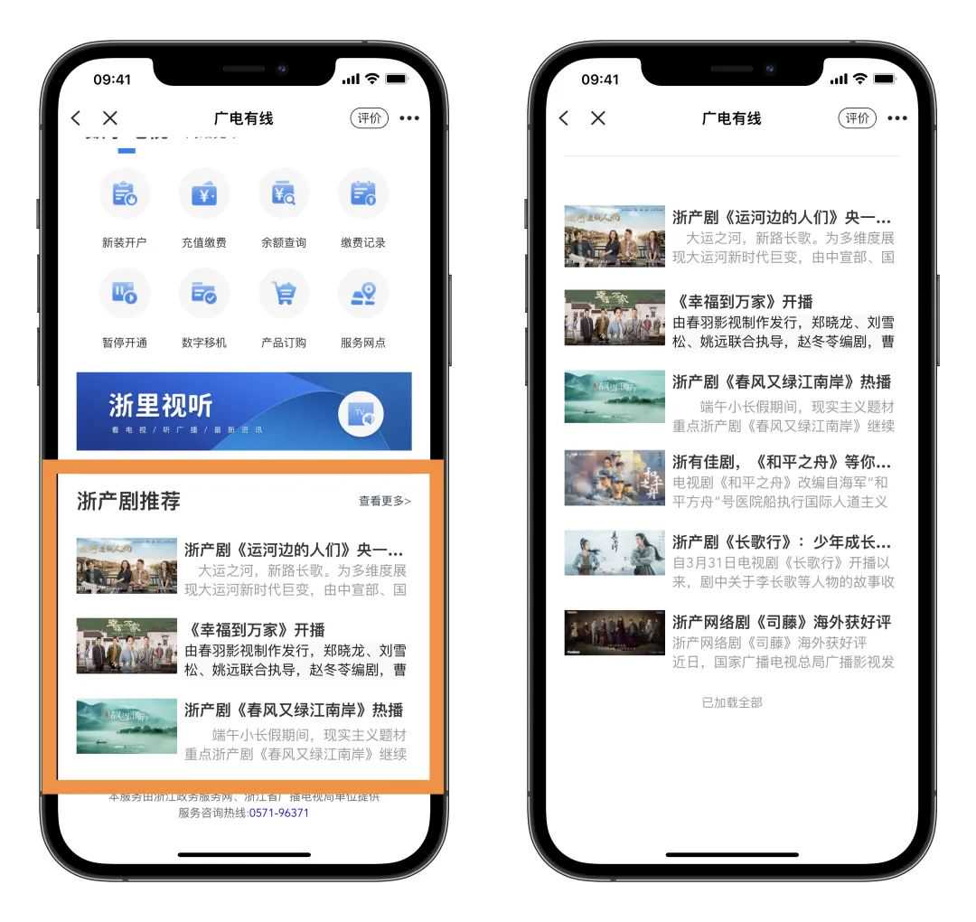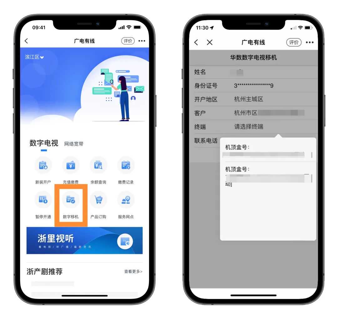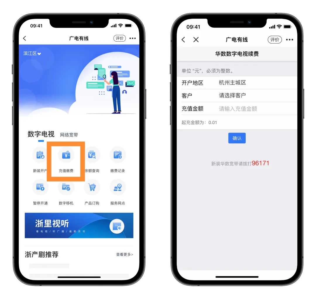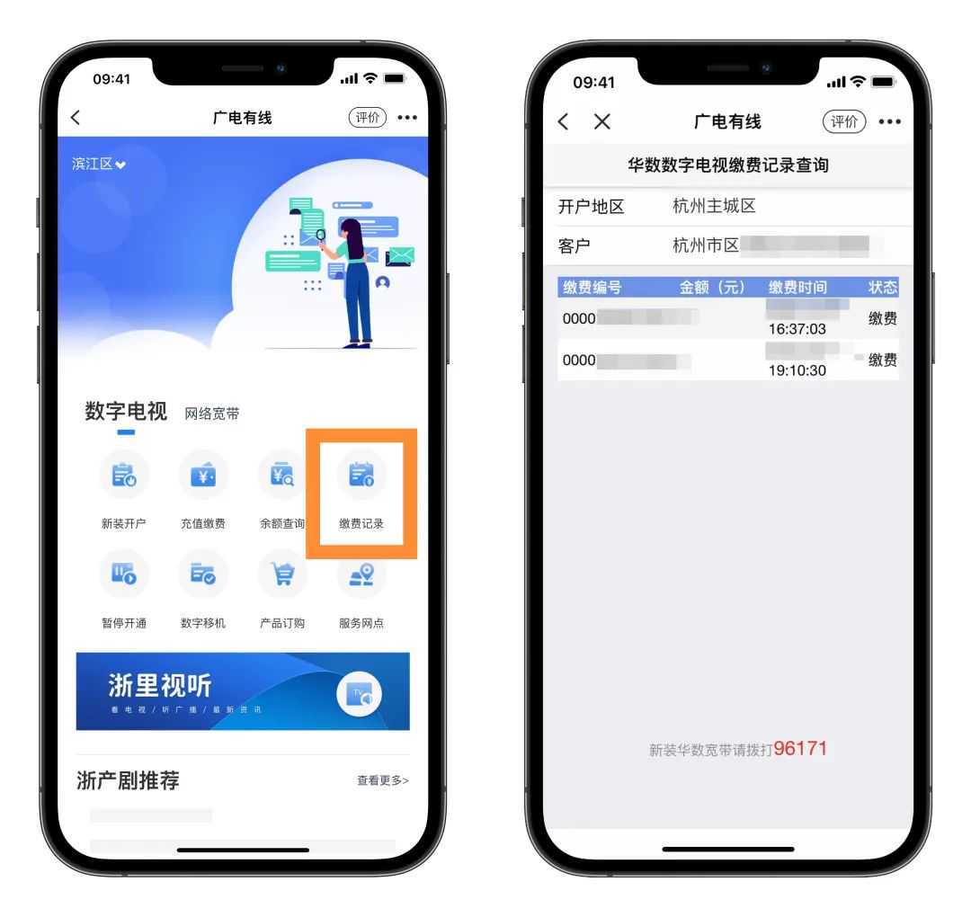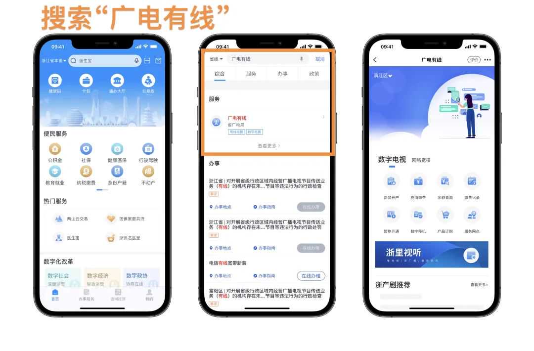 您可通过“浙里办”APP打开“广电有线”,在掌上办理数字电视及网络宽带业务的新装、充值缴费、余额查询、缴费记录查询、账单查询、暂停、移机、套餐订购、华数服务网点位置查询等服务,还能收听收看直播节目,了解浙产剧的影视资讯。
