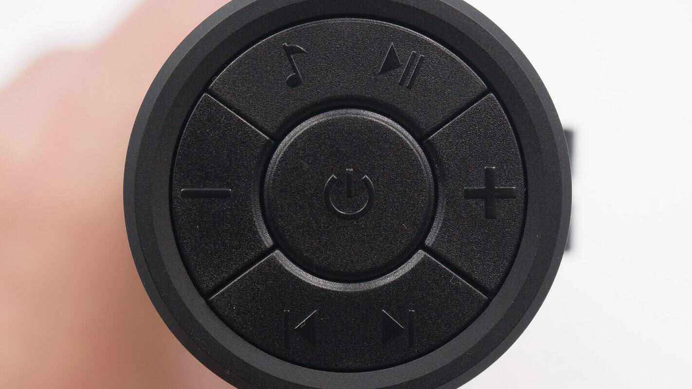 手电底部设有开关键、音乐播放功能键以及灯光档位调节键。