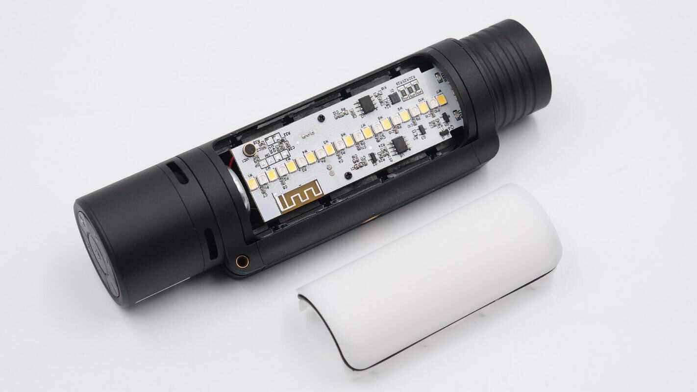 手电主体内部结构一览,能够看到内部的电池和PCB板。