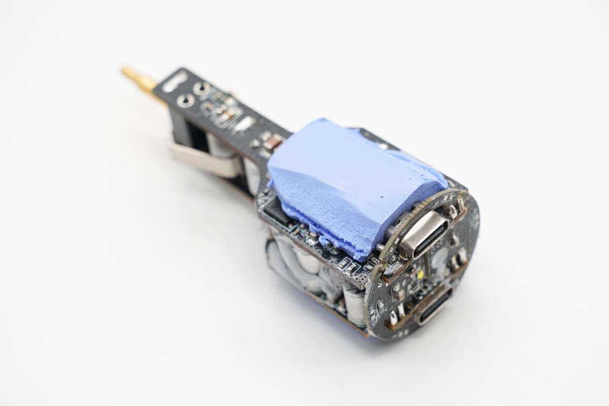 车充内部使用一颗钰泰ETA2821降压芯片,为两颗水芯电子SOC芯片供电,降低待机损耗。PCBA模块由三块PCB焊接组成,PCB之间的空间焊接滤波电容和磁环电感,空隙填充导热胶并粘贴导热垫,提升散热性能。车充内部用料和做工扎实,功能实用,能够满足消费者前沿快充需求。