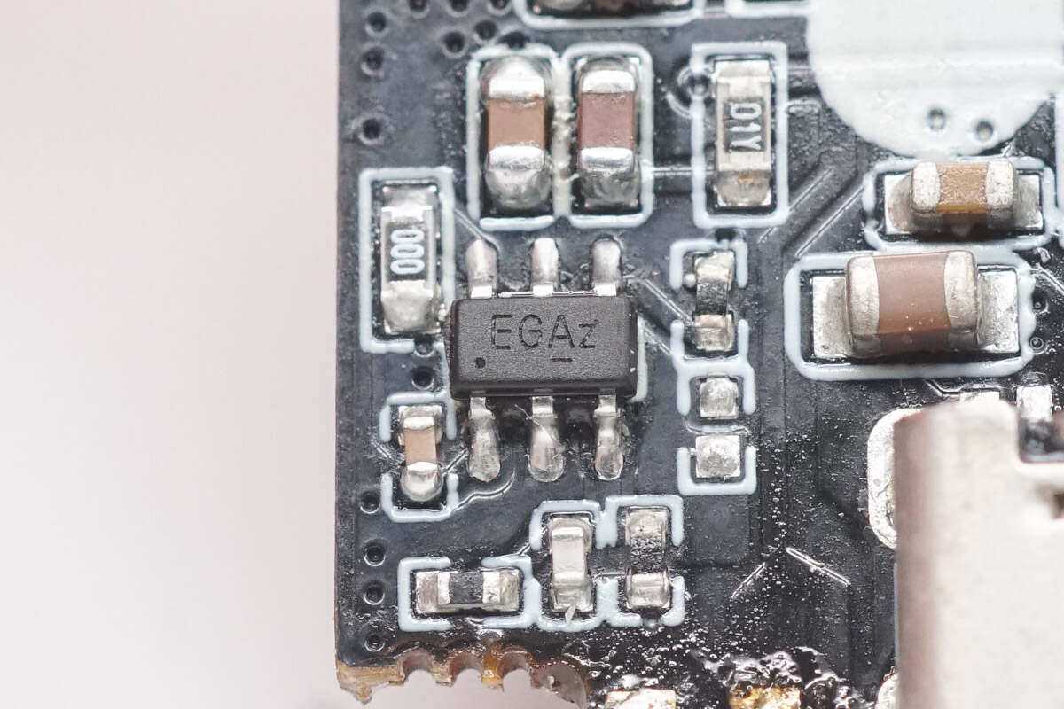 PCB背面焊接保险丝,MLCC滤波电容,同步升降压开关管,VBUS开关管和USB-C母座。