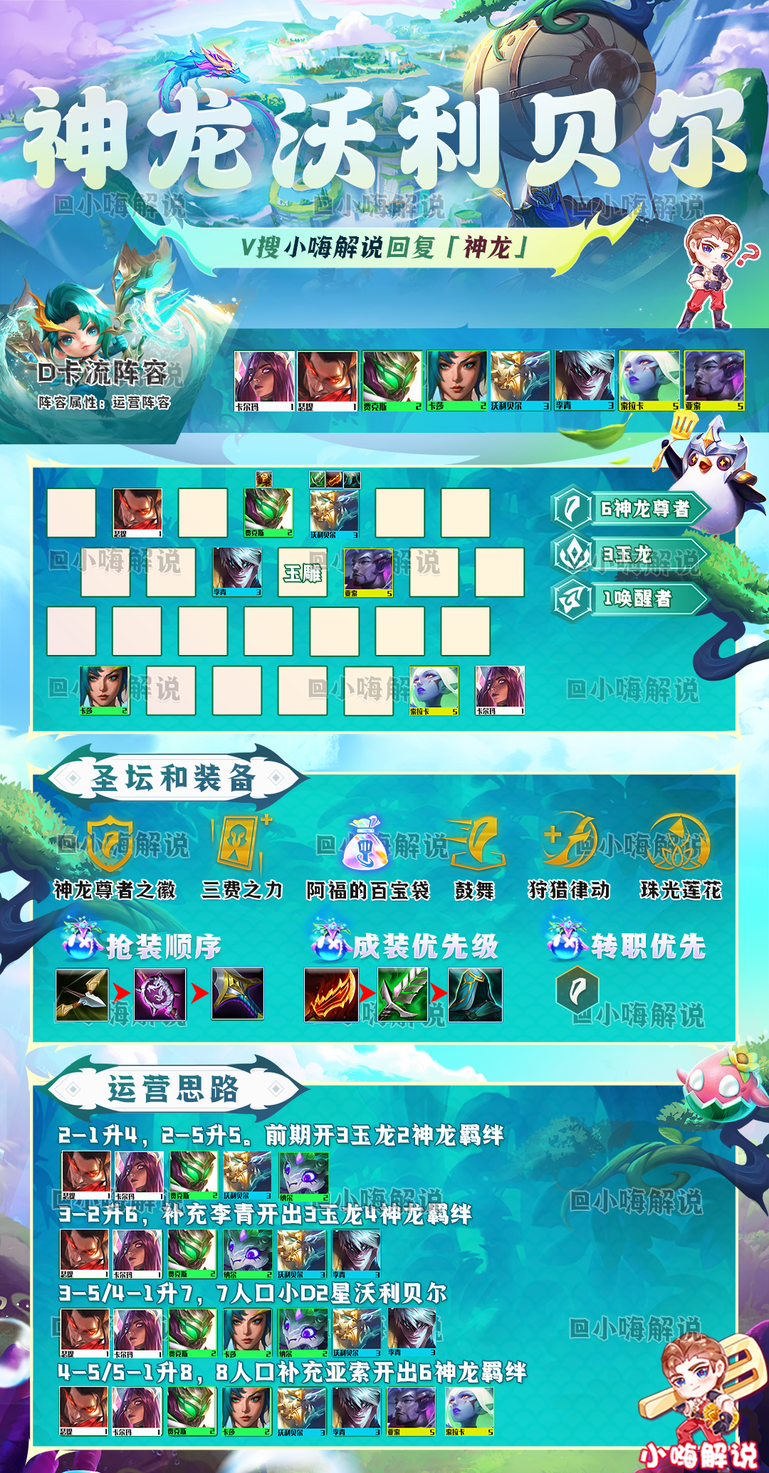 后期阵容:4-6/5-1拉8人口,8人口大搜找到亚索开出6神龙羁绊,8人口优先找到3星沃利贝尔。其他追到2星以后,可以考虑上5金麟龙/7玉龙/6神龙这三个羁绊。