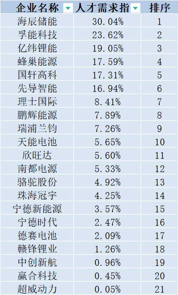 需求人数较多的企业有海辰储能、孚能科技、亿纬锂能、蜂巢能源、国轩高科、先导智能、理士国际、鹏辉能源、瑞浦兰钧。
