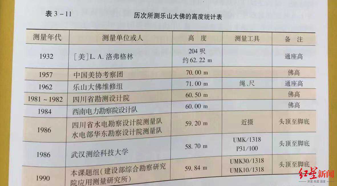 不过,根据四川省文物考古研究院和乐山大佛乌尤文物保护管理局合编的《治理乐山大佛的前期研究》显示,从1932年至1990年,历次所测乐山大佛高度均不一样。