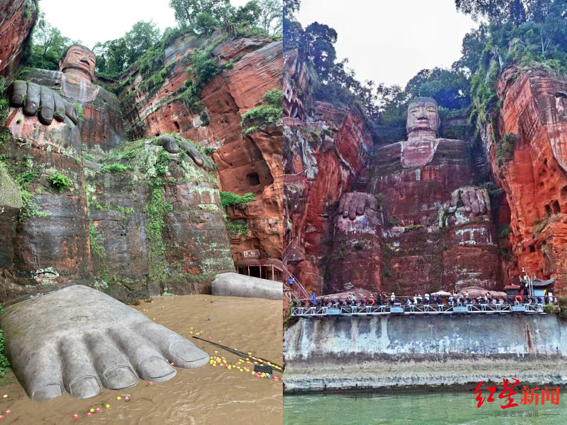 ↑2020年8月18日和2022年8月18日乐山大佛对比照(孔胜、吴芸摄)