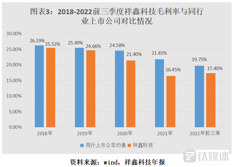 据Wind数据,2018—2022年前三季度,A股209家汽车零部件上市公司的毛利率均值分别为26.29%、25.49%、24.58%、21.81%、19.75%,而祥鑫科技的毛利率则分别为25.52%、24.66%、21.4%、16.45%、17.4%。可以看到,自2020年开始,祥鑫科技与同行的毛利率差距逐渐拉大。