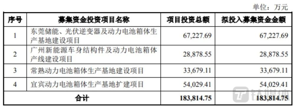 根据方案,本次募投项目包括东莞储能、光伏逆变器及动力电池箱体生产基地建设项目、广州新能源车身结构件及动力电池箱体生产线建设项目、常熟动力电池箱体生产基地建设项目、宜宾动力电池箱体生产基地扩建项目。募投项目达产年合计将实现170万套动力电池箱体、15万套商用逆变器、20万套家用逆变器、20万套车身结构件的生产能力。