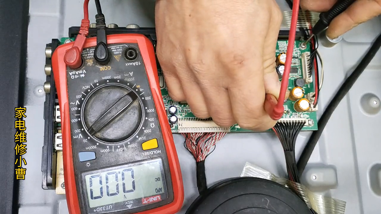 已经拆开了,还是先测关键电压,3.3伏,它是8258的机芯。机芯有一个通病,就是3842比较容易损坏。量一下芯片的电压,输入角12伏正常的,输出角没有电压,正常这里应该是有1.2伏电压的,没有电压肯定是不正常。