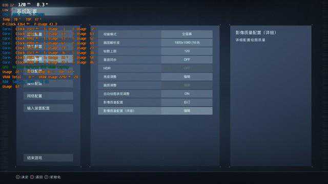 另外我们从CPU与GPU占用率也可以看到,《装甲核心6:境界天火》的硬件压力还是比较大的,CPU平均占用率达到了35%,这在游戏中是比较高的;GPU整体占用率也达到了82%,显存占用率57%,同时内存占用率也达到了67%,如果CPU和GPU性能差一些的话,最高画质下流畅运行还真是比较困难的。