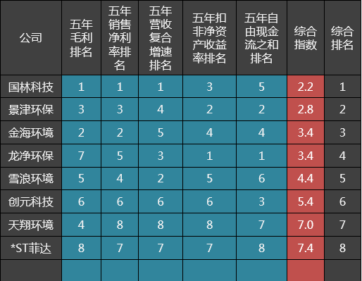 我们将五年毛利排名、五年销售净利率排名、五年营收复合增速排名、五年扣非净资产收益率排名、五年自由现金流之和排名视为权重,求其均值,则综合排名如下: