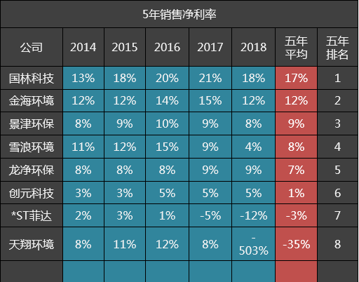 8家公司中,有1家五年扣非销售净利率均值超15%,为毛利率排名第一的国林科技。龙净环保的均值7%,排名第五。