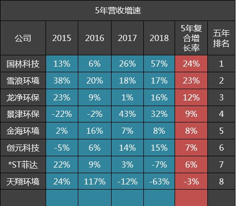 8家公司中,五年营收复合增速超15%的公司有2家,分别是国林科技和雪浪环境。