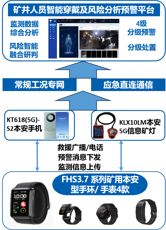 “矿井人员智能穿戴风险分析预警关键技术与装备”项目,由井下人员多参数联合健康监测的矿用智能穿戴系列设备、本安型5G智能信息矿灯和矿井人员智能穿戴风险分析预警平台组成,解决了井下环境作业人员缺乏在线健康监测管控机制和精确监测手段、作业人员携带装备多且负担重、人员健康与环境风险难以关联分析和预警处置等关键技术难题,突破了井下人员多参数联合健康监测技术,构建了面向常规生产和应急救援的终端设备无线接入系统架构,实现了煤矿井下人员健康与环境参数实时监测、风险综合评估及分级预警处置。项目成果在国能神东锦界煤矿等现场开展了工业性试验及应用,有效保障了井下人员健康与安全,提升了煤矿安全生产水平。