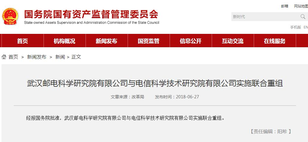2018年6月27日:报国务院批准,武汉邮电科学研究院有限公司与电信科学技术研究院有限公司实施联合重组为中国信科集团