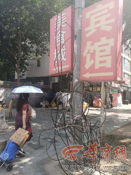 该处黄土裸露的区域还竖着一根线杆,线杆下方一团缆线杂乱地盘城一团垂在地面,线杆上还挂着“宾馆”、“美食城”的红色小灯箱广告。