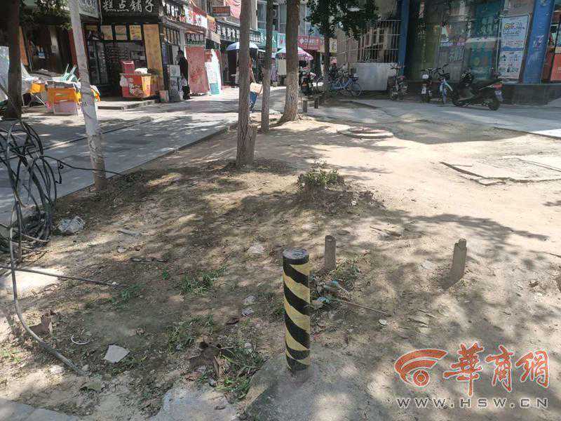 在枫韵蓝湾小区南门外老百姓大药房西侧,人行道边沿区域黄土裸露,地面没有硬化,“一下雨就成了烂泥塘了,简直走不成!”附近一位居民称,该处路面未硬化的问题已经有好几年时间,迟迟未见有人处理。除了黄土裸露外,地面上还竖着不少铁柱,这些铁柱有的极其锋利,且柱桶内还塞着卫生纸、塑料袋、火腿肠皮等垃圾。