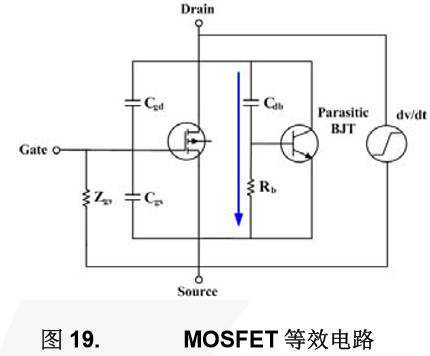 另一种失效模式是击穿dv/dt。它是击穿和静态dv/dt的组合。功率器件同时承受雪崩电流和位移电流。如果开关过程非常快,在体二极管反向恢复过程中,漏源极电压可能超过大额定值。例如,在图16中,漏源极电压大值超过了570V,但器件为500V额定电压的MOSFET。过高的电压峰值使MOSFET进入击穿模式,位移电流通过P-N结。这就是雪崩击穿的机理。另外,过高的dv/dt会影响器件的失效点。dv/dt越大,建立起的位移电流就越大。位移电流叠加到雪崩电流后,器件受到伤害,导致失效。基本上,导致失效的根本原因是大电流、高温度引起的寄生BJT导通,但主要原因是体二极管反向恢复或击穿。实践中,这两种失效模式随机发生,有时同时发生。