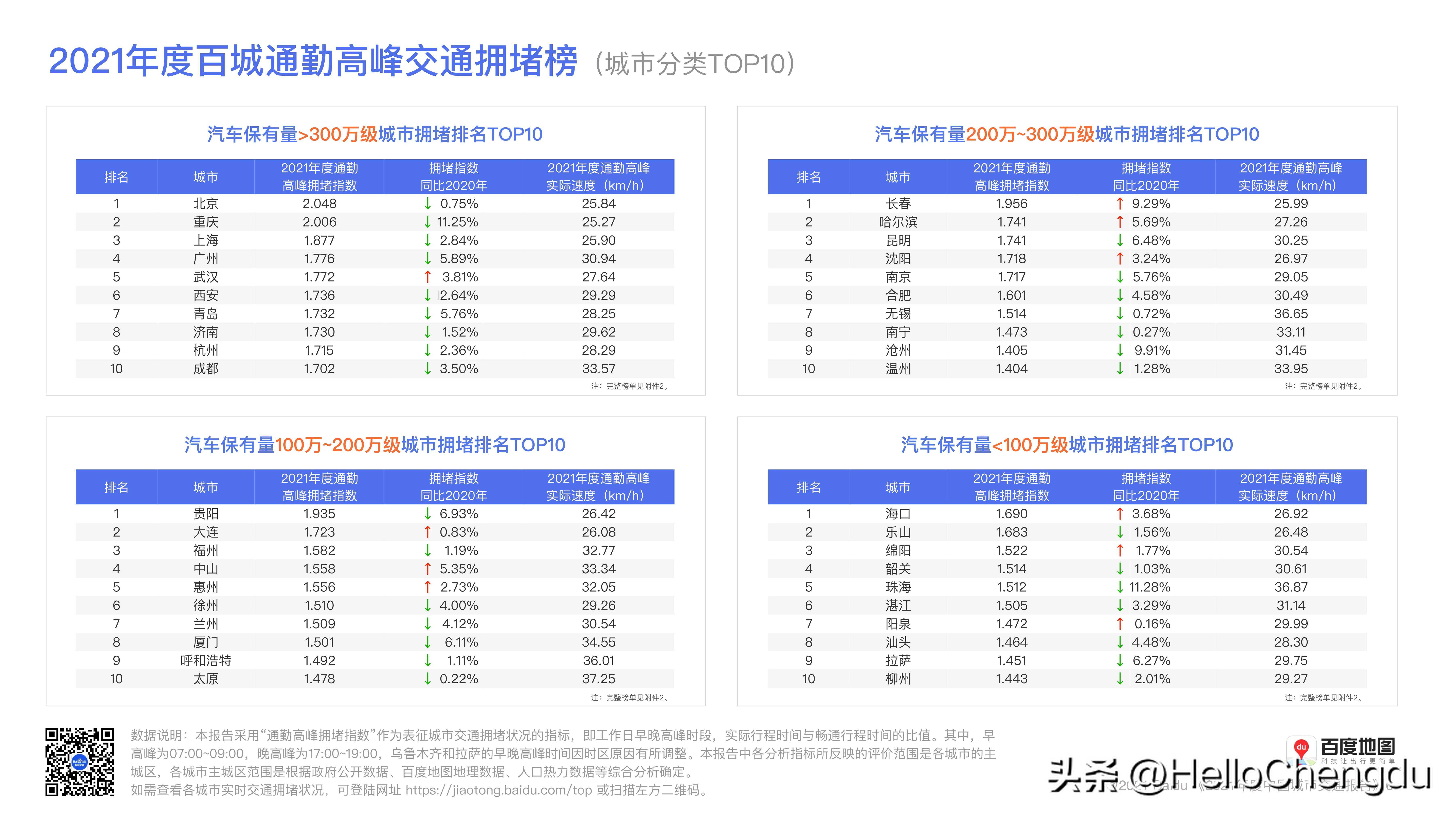 2021年度百城通勤高峰拥堵程度,成都未进前十,排名全国第十七。
