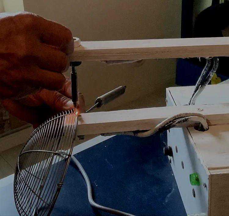 外壳,操作臂均用木板;点焊头两端材质为铜材,分别用铜螺桿及电烙铁头改制。