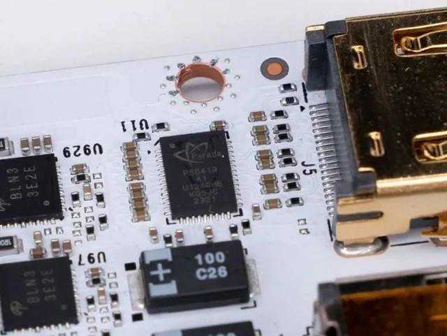 影驰20周年显卡是业界首次搭载HDMIRetimer技术的显卡,得益于谱瑞PS8419芯片,这项技术从源头出发,对显示源的HDMI信号进行放大和重建,以提升信号的强度和质量,从而确保HDMI信号在长距离的传输下,依旧信号稳定、画质高清。