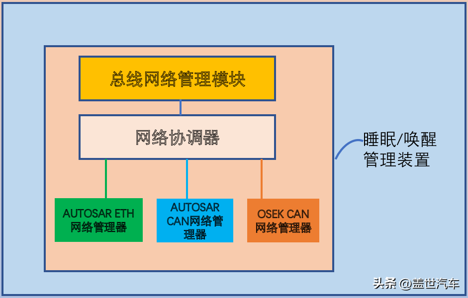 当唤醒条件被触发时,应用层调用总网络管理模块触发时当前网络处于网络模式的指令;网络协调器触发以太网网络和CAN网络,AUTOSAR协议的触发网络请求,OSEK协议触发网络请求;AUTOSAR以太网、AUTOSARCAN网络管理器、OSEKCAN网络管理器按照其协议发起网络唤醒,建立逻辑环;总线网络管理模块唤醒总线上控制器,唤醒流程结束。