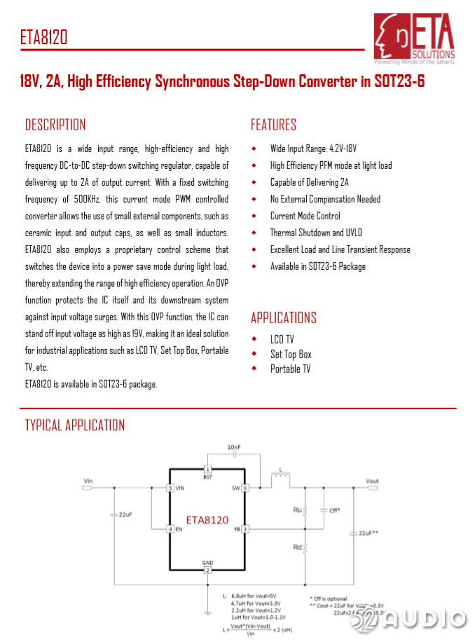 钰泰ETA812018V输入2A输出,高效率同步整流降压转换器,为功放IC供电。