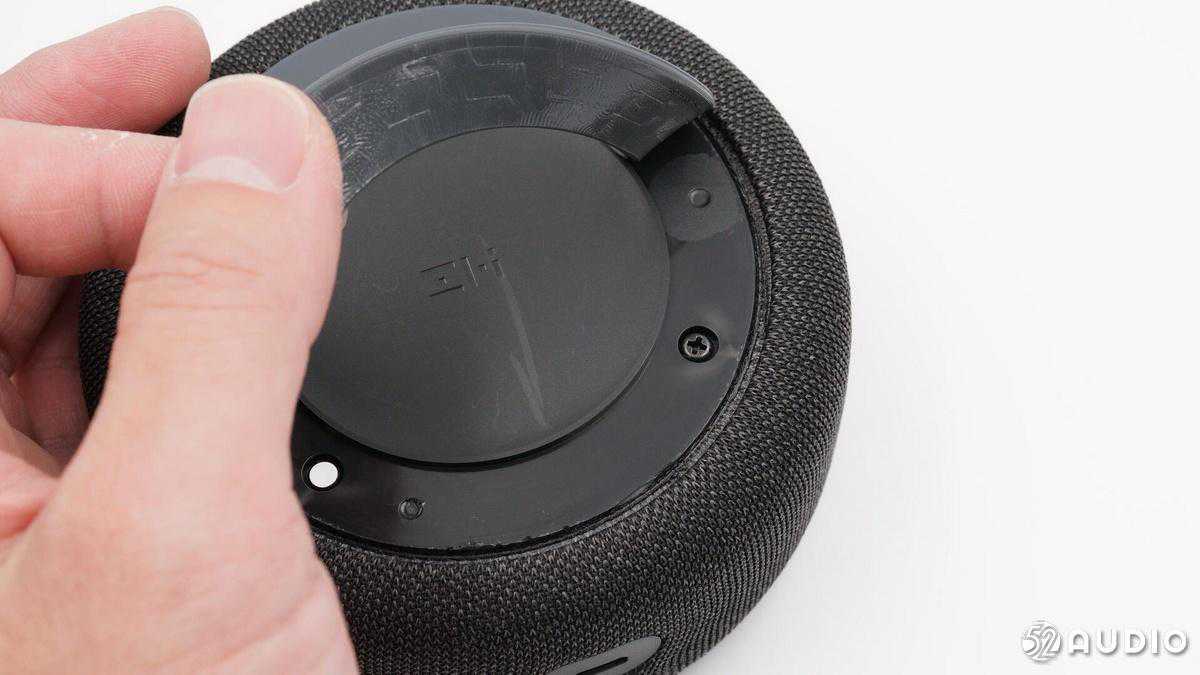 音箱底部的防滑胶条采用双面胶固定,撕开可见固定螺丝,其中一颗螺丝上有白色易碎贴。