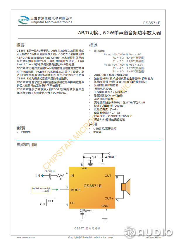来自CHIPSTAR上海智浦欣微的CS8571E,5.2W单声道音频功率放大器,AB类功放D类功放两种模式可切换。