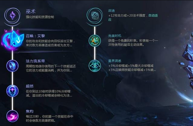 符文选择:主系巫术、艾黎、法力流系带、超然、焦灼;副系:启迪、完美时机、星界洞悉。