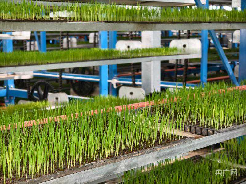 随着链条转动,循环运动式苗床上的秧盘,从上到下循环变换位置,保证每一株苗叶面均匀补水,处于相同的光照和最适宜生长的25至30摄氏度的环境中,在稳定温暖湿润的环境下,秧苗生机盎然。