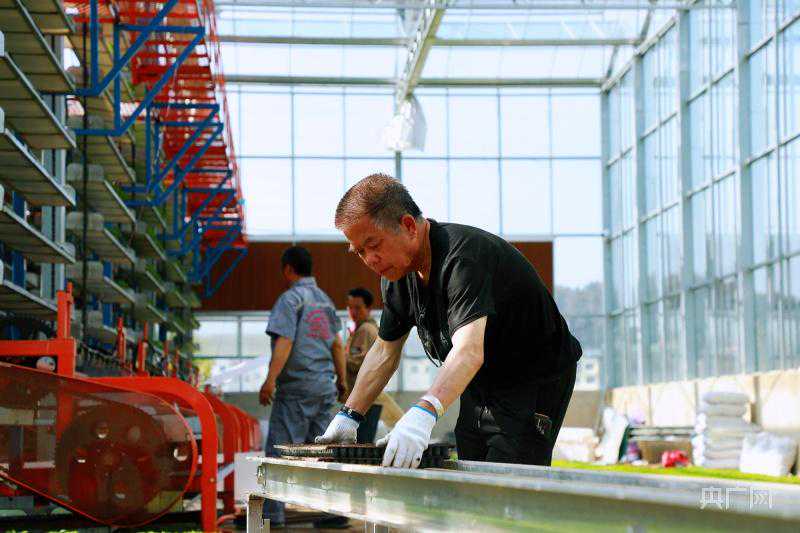 工人正将钵盘上架到立体式工厂化育秧机(央广网记者栾小琳摄)