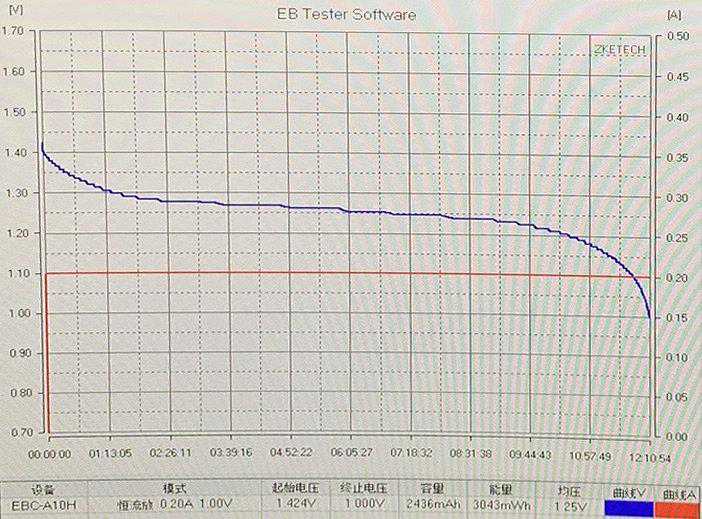 很典型的镍氢电池放电曲线,电压随着容量的下降而下降,平均电压1.2V左右,多数能量在1.2V左右放出。0.2A小电流放出了2436mAh,与标称2550mAh很接近,1.0V大电流也放出了2280mAh,损失不大。