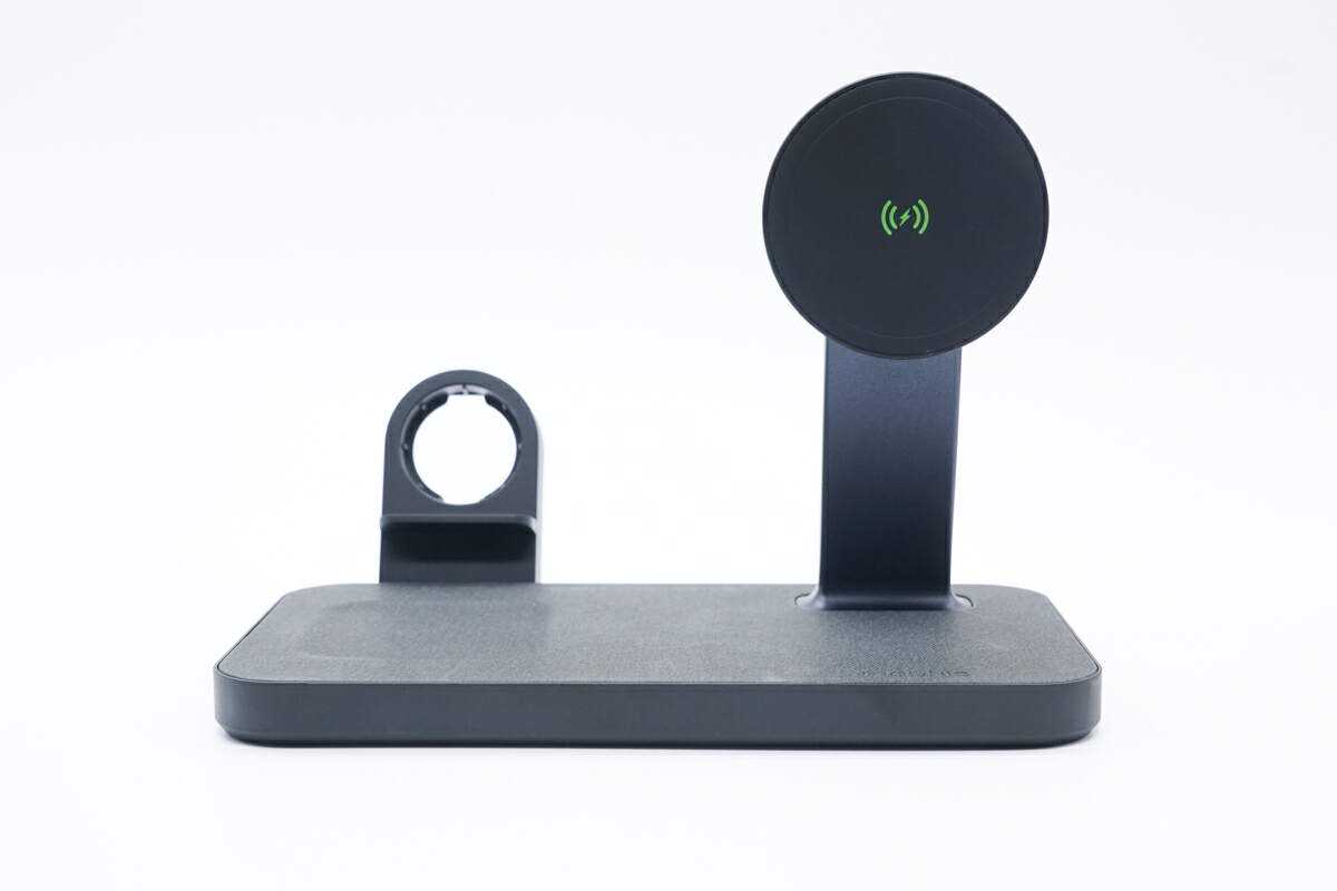贝尔金15W三合一磁吸无线充电板贝尔金这款三合一磁吸无线充电板主打苹果全家桶同时无线充电卖点,外出一天回到家里将设备随手一放即进行充电,使用十分方便。而且通过拆解发现,手机、手表无线充模块均为苹果原装,因此不仅质量可靠,iPhone12/13、AppleWatch也能获得和苹果原装配件一样的磁吸充电效果。