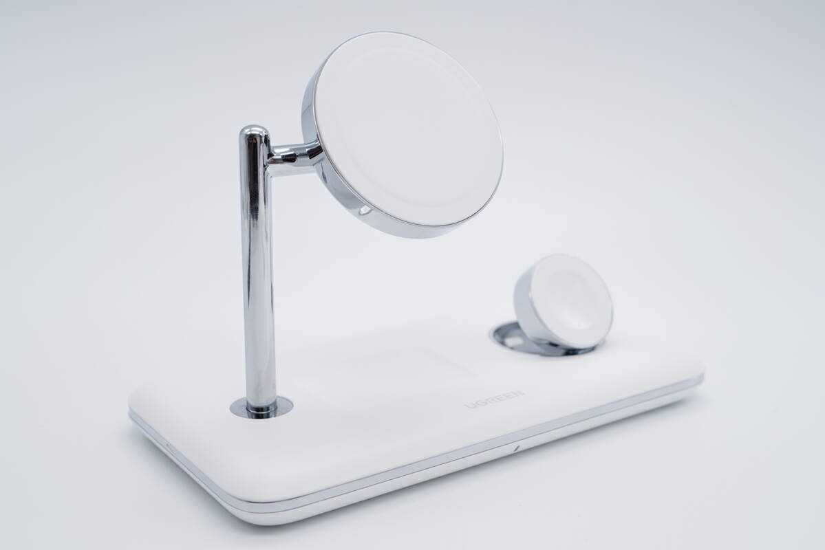 绿联15W三合一磁吸无线充电器绿联推出的多功能无线充电器非常美观,白色搭配银色金属亮色非常干净,摆放起来很是醒目,辨识度高。无线充内置两个苹果官方的磁吸无线充电模块,用于手机和手表磁吸无线充电。手机磁吸充电可调节角度,便于充电过程中观察信息。