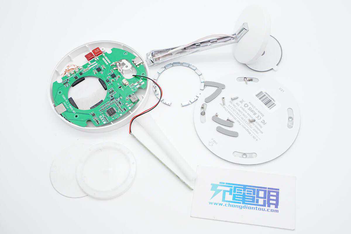 充电头网通过拆解了解到,无线充底座内置配重铁,使得产品日常使用不易翻倒,支撑板内加入金属片提升强度,不易折断。此外PCB板上USB母座、电感、电容等器件均沉板处理,降低机身厚度,设计细节讲究。