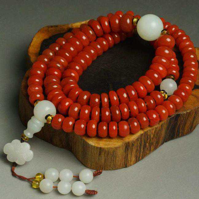 念珠是佛教礼敬法器的一种,一般一串有108颗。在修五加行之大礼拜、供曼扎时,为了方便计数,也用25颗一串的念珠。藏传佛教念珠,一般由念珠本身、节珠(大家更常称作隔珠)、佛头、云珠或背云、计数器、卡子、挂环等几大类构成,在这些大类配件存在的同时还伴随着各种各样有意义的小配件的存在。