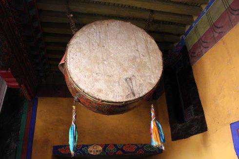 法鼓是藏传佛教中的礼赞法器之一,种类很多,如大鼓、铜鼓、腰鼓、曲柄鼓、羯鼓、嘎巴拉鼓等。主要用于佛教庆典、宗教节日、开光仪典等重大喜庆法事活动中。曲柄鼓的鼓锤是弯的,就像一张弓,鼓面直径约1米,下有一柄。诵经时,喇嘛左手持鼓柄,右手用曲柄鼓锤敲击伴奏。嘎巴拉鼓,藏语称“扎玛如”,鼓腰箍镶宝石镂花金片,坠飘带,两面蒙皮,鼓体有木、象牙和人头骨几种。法会上嘎巴拉鼓多与金刚铃一起演奏。