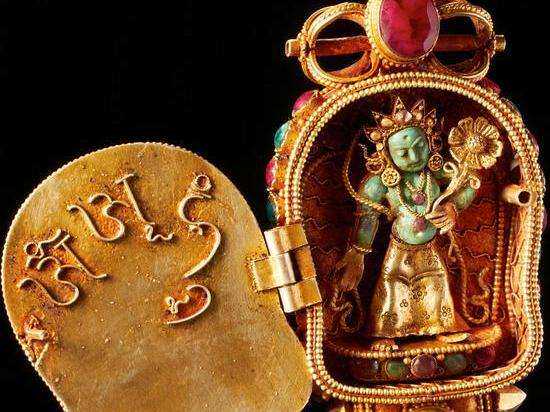 嘎乌盒是藏传佛教的护身法器之一,可以用来避邪、护身、镇宅和增福等。嘎乌,汉语为“佛盒”,一般用金、银、铜制成,并雕饰有精美的图案,有的甚至还镶嵌松石、珍珠、珊瑚等宝石。嘎乌盒里面装有泥塑或金属制小佛像或经卷,随身佩带,用来祈佛保佑平安吉祥。