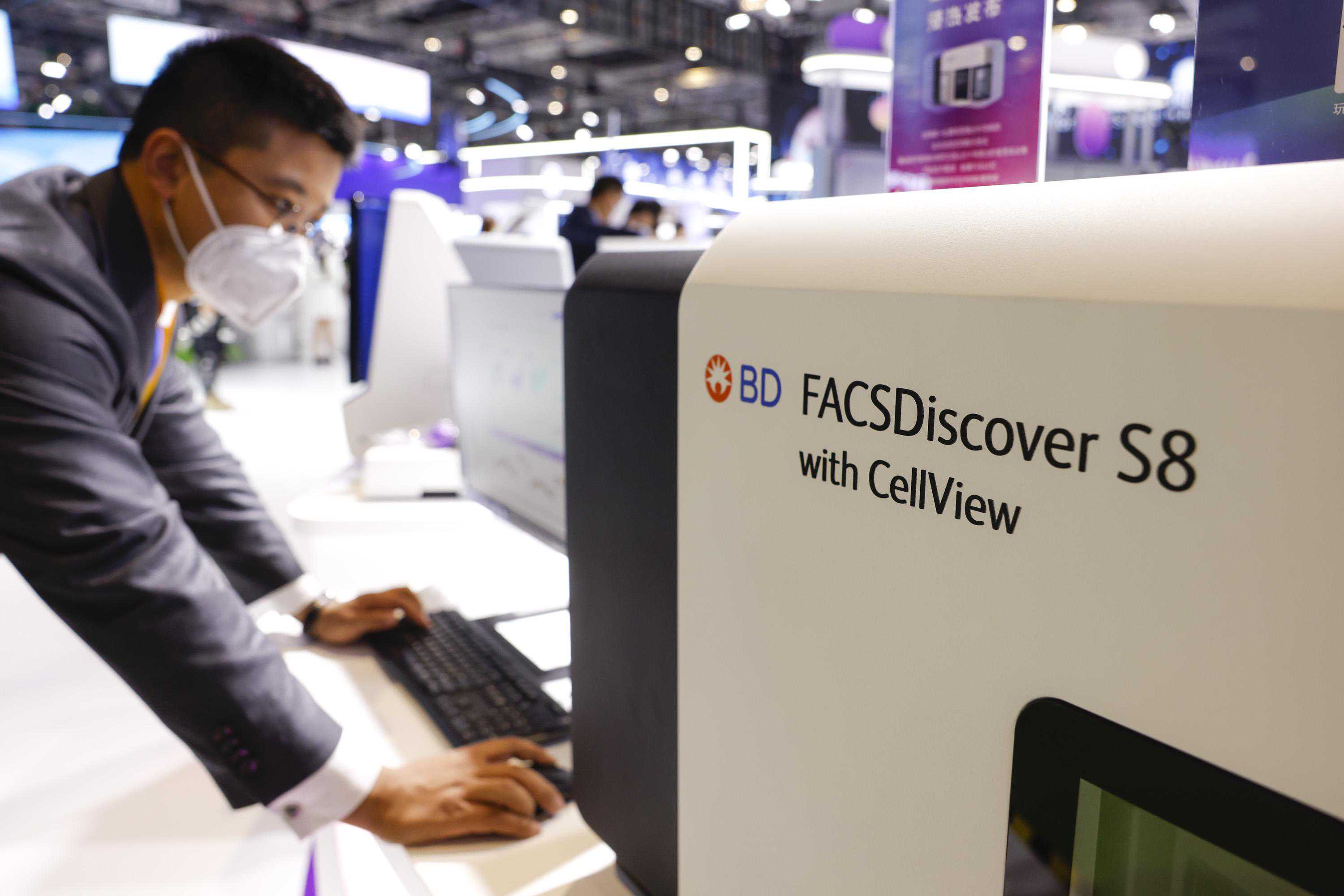 流式细胞术是指在细胞分子水平上,对单个细胞或其他生物的粒子进行多参数、快速的定量分析。这项技术可以高速分析上万个细胞,并能同时从一个细胞中测得多个参数。具有速度快、精度高、准确性好的优点,是当代最先进的细胞定量分析技术之一。此次进博会上亮相的国内首发,搭载CellView?成像技术的BDFACSDiscover?S8细胞分选仪,是全球第一台具有图像分析功能的全光谱流式细胞分选仪。它的出现标志着全球流式细胞术从传统和光谱流式阶段,全面进入到“图·谱”流式技术的全新时代。据悉,国内众多高校实验室,医院,研究所已前来咨询预购,预计23年上半年过审上市,首批交付。