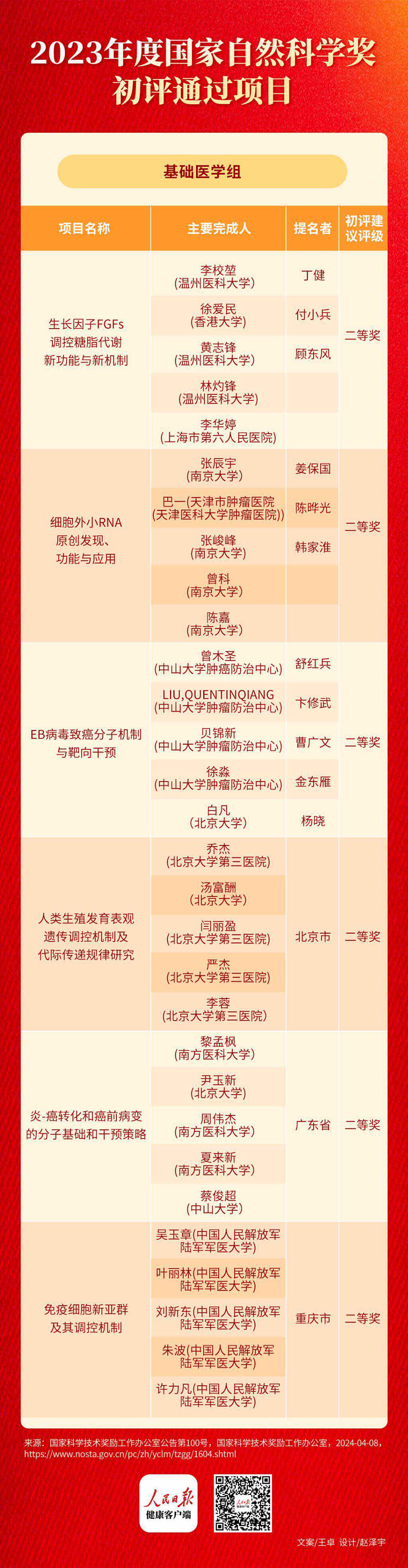 在通过初评的59项国家自然科学奖项目中,基础医学组有个6项目均获评二等奖,分别为“生长因子FGFs调控糖脂代谢新功能与新机制”“细胞外小RNA原创发现、功能与应用”“EB病毒致癌分子机制与靶向干预”“人类生殖发育表观遗传调控机制及代际传递规律研究”“炎-癌转化和癌前病变的分子基础和干预策略”“免疫细胞新亚群及其调控机制”。