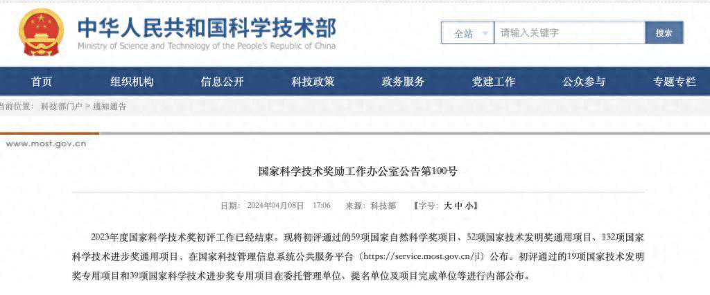 4月8日,中华人民共和国科学技术部发布《国家科学技术奖励工作办公室公告第100号》,2023年度国家科学技术奖初评工作已经结束。其中,59项国家自然科学奖项目、52项国家技术发明奖通用项目、132项国家科学技术进步奖通用项目通过初评。