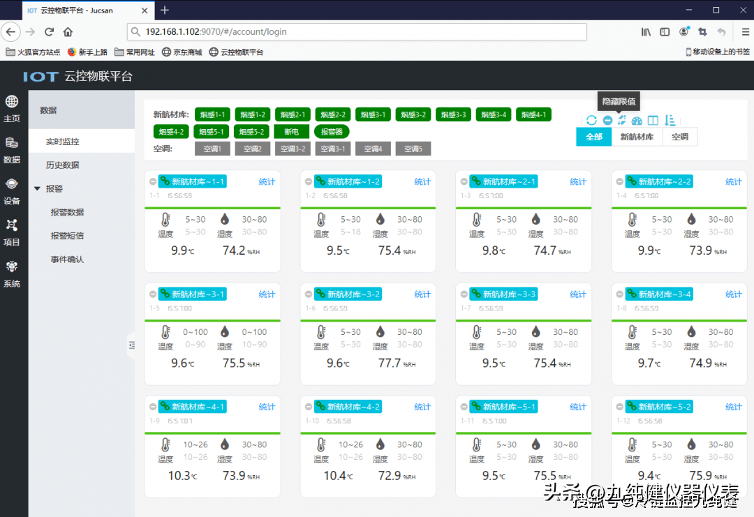 灵活设定报警值,实现对除湿、消毒或空调设备的自动控制。当温湿度数值、环境数据达到报警条件时,通过声光报警提示超限报警,通过短信报警发送报警信息,最多支持5部手机号;