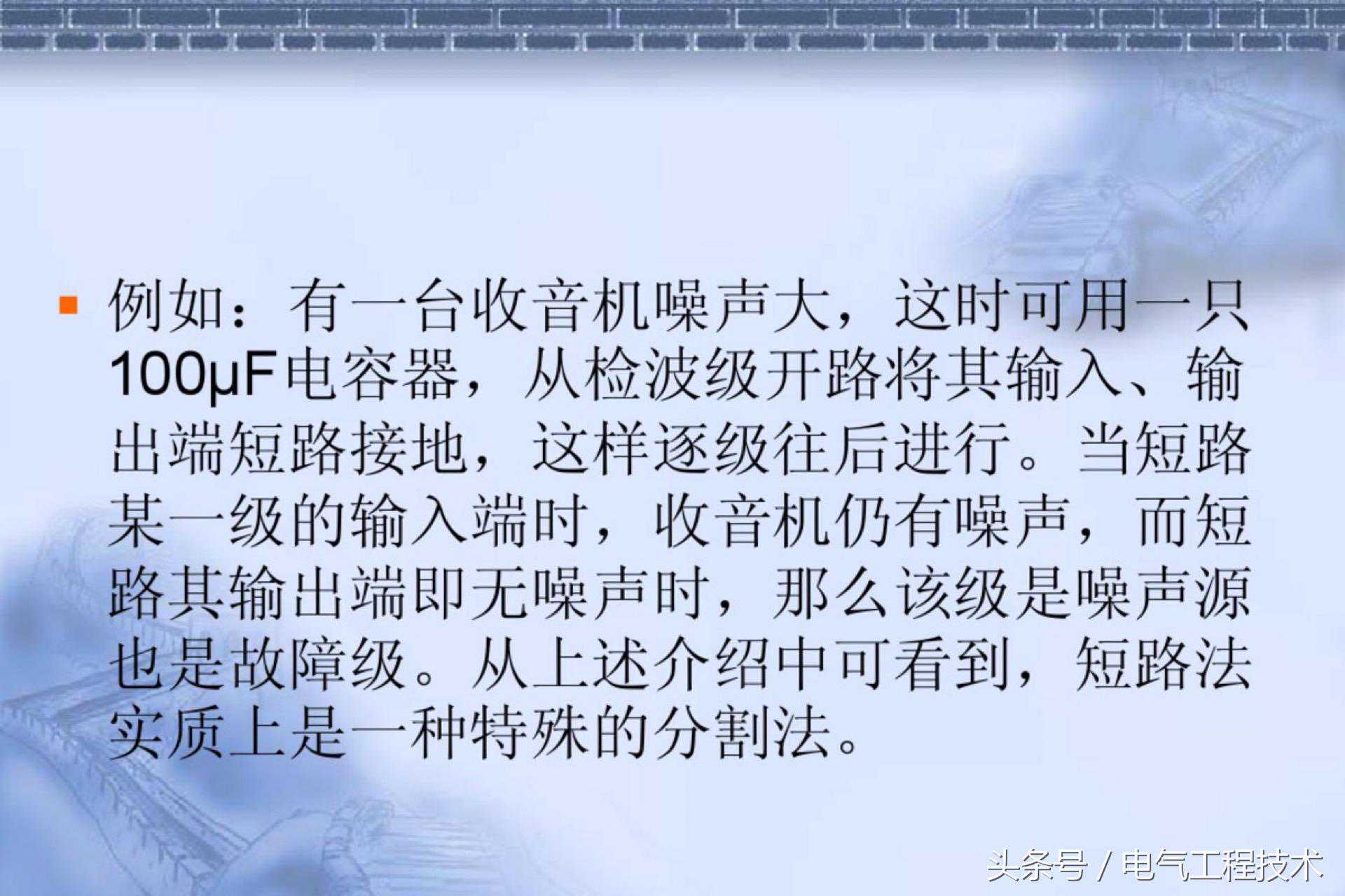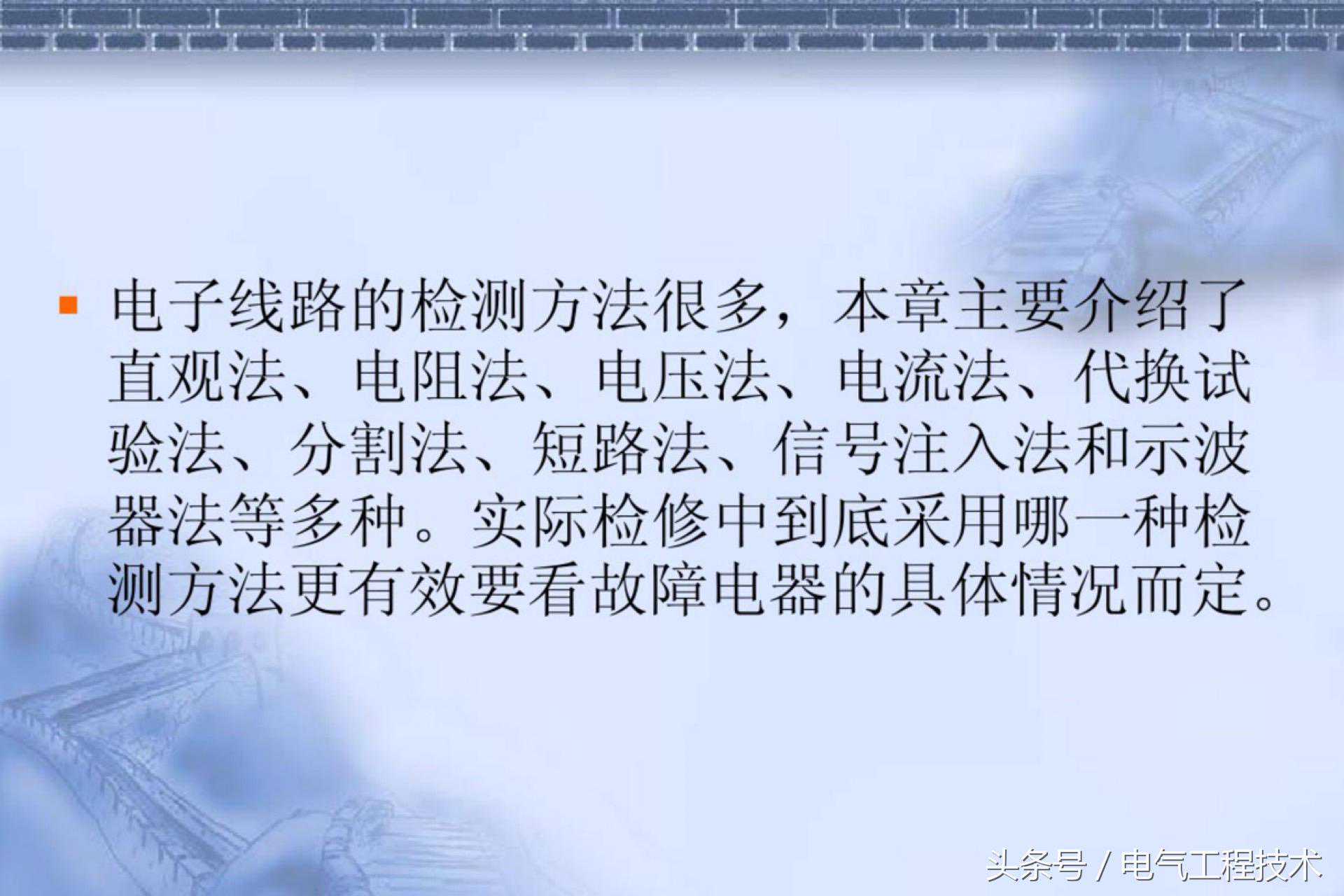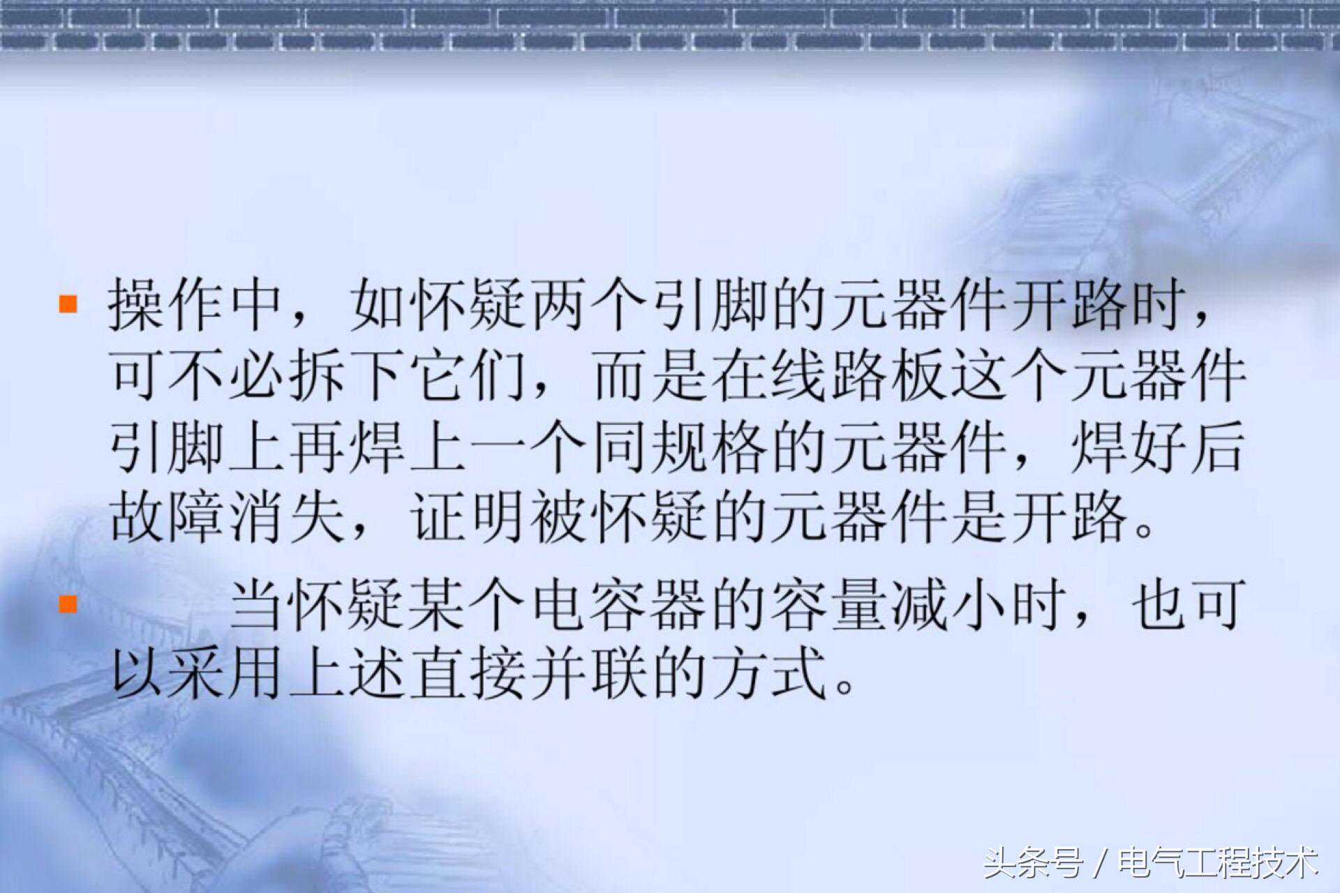 谈起电子电路,相信很多的电子电工师傅都很熟悉,对于电子电路老师傅而言,排查电子电路故障并非难事,一般情况下很快就可以找出故障点,但是对于大多数的初学者而言,都普遍有无从下手的经历,当然,电子电路维修除了要有比较丰富的实践经验外,还应具备很扎实的理论知识和一定的逻辑推理能力,除此之外,掌握适合自己的电子电路故障排查方法也是非常有必要的,有了一定的故障排查方法,可以让我们的故障排查更加的清晰化和系统化,自然的,排查故障的效率也会跟着提高,常见的维修方法有看,摸,听,测量等等,今天我们就来看一看电子电工老师傅总结的19个故障排查方法,适合自己的就是最好的: